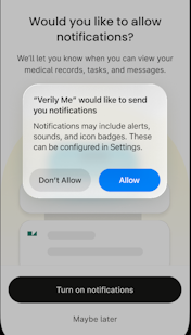 Tap Turn on notifications to allow Verily Me to notify you when you can view your medical records, tasks, and messages.
